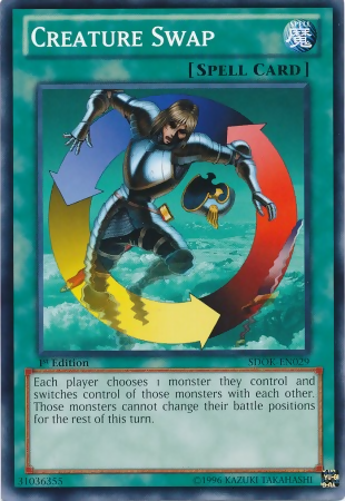 Each player chooses 1 monster they control and switches control of those monsters with each other. Those monsters cannot change their battle positions for the rest of this turn.